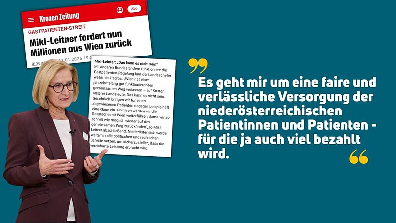 Mit anderen Bundesländern funktioniere die Gastpatienten-Regelung weiterhin klaglos. „Wien hat einen jahrzehntelang gut funktionierenden gemeinsamen Weg verlassen – auf Kosten unserer Landsleute. Das kann es nicht sein. Gerichtlich bringen wir für einen abgewiesenen Patienten dagegen beispielhaft eine Klage ein. Politisch werden wir die Gespräche mit Wien weiterführen, damit wir so schnell wie möglich wieder auf den gemeinsamen Weg zurückfinden.“, so Mikl-Leitner abschließend. Niederösterreich werde weiterhin alle politischen und rechtlichen Schritte setzen, um sicherzustellen, dass die vereinbarte Leistung erbracht wird.